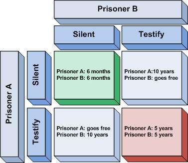 If both suspects stay silent, they both get off with a very light sentence. If they both turn on each other, they both get a longer sentence. And if only one of them rats out the other, the suspect who squeals goes free, while the one who stayed silent receives the worst sentence.